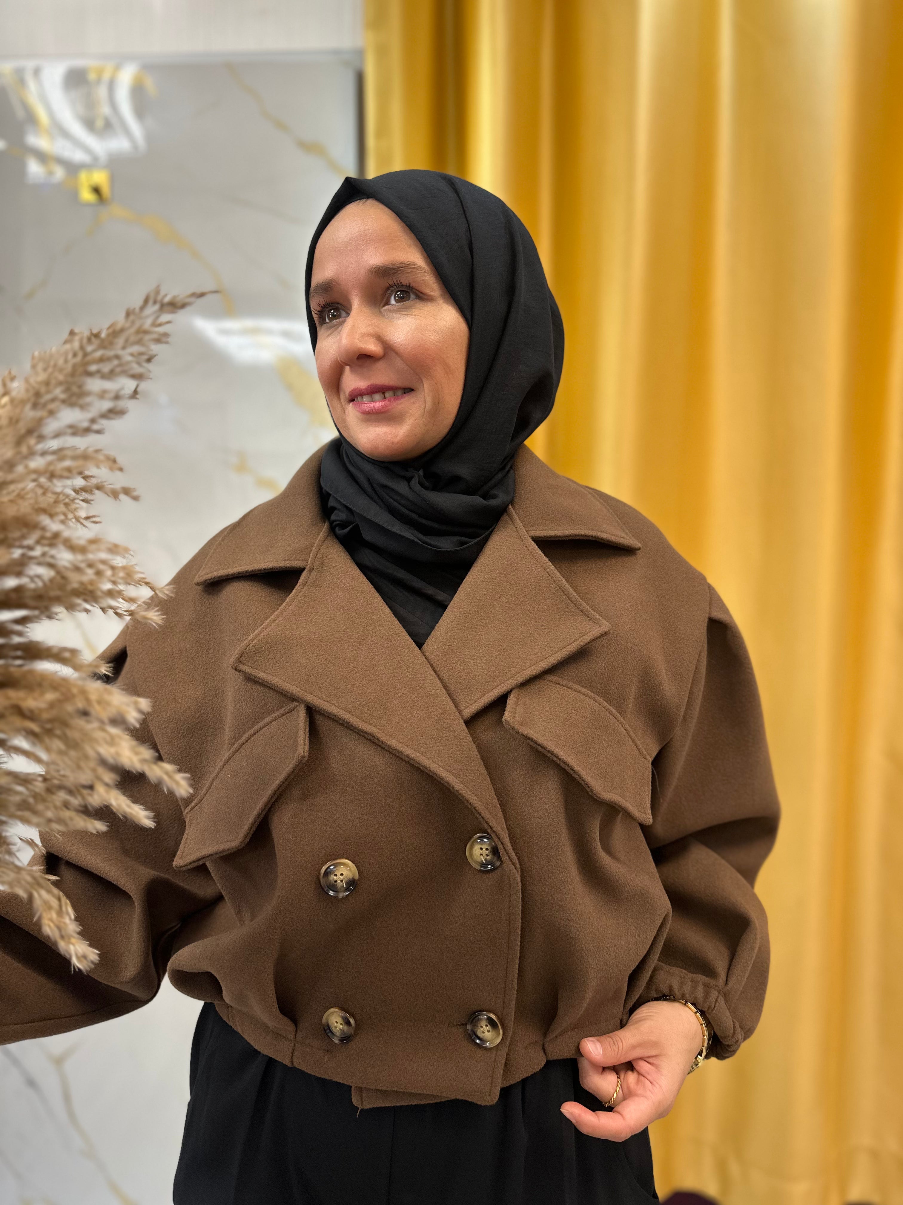 Şık düğme detayları ve geniş kesimiyle modern kısa ceket. Yumuşak kumaşı rahat bir uyum sağlayarak sonbahar trendlerine mükemmel uyum sağlar.